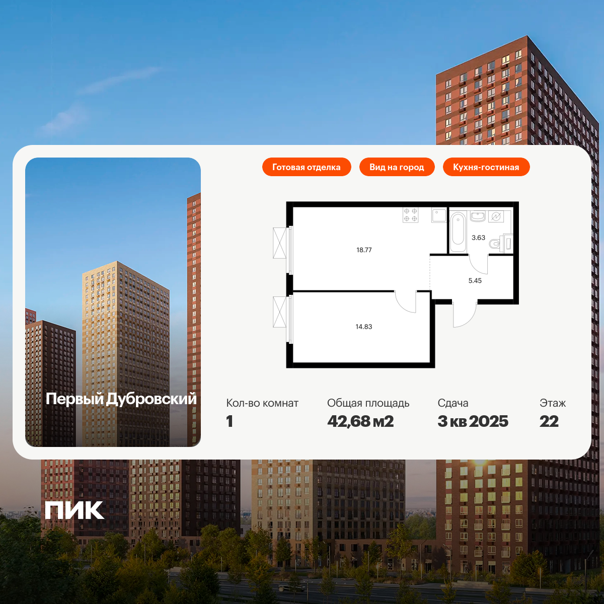 Продаётся 1-комн.квартира площадью 42.68 кв.м на 22 этаже 33 этажного дома (Корпус 1.3, секция 1) проекта ПИК Первый Дубровский. Светлый просторный подъезд на уровне земли, функциональная планировка, большие окна, с отделкой.