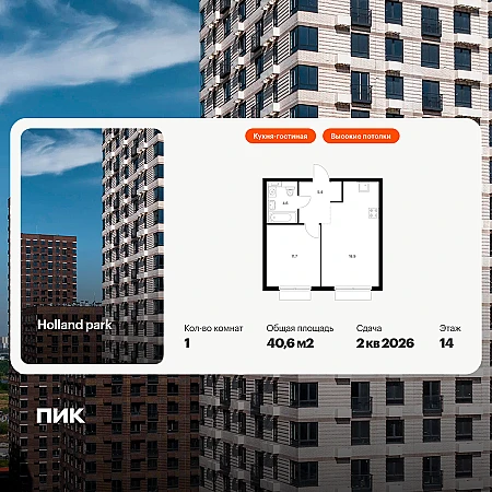 Продаётся 1-комн.квартира площадью 40.60 кв.м на 14 этаже 14 этажного дома (Корпус 8, секция 3) проекта ПИК Holland park. Светлый просторный подъезд на уровне земли, функциональная планировка, большие окна.