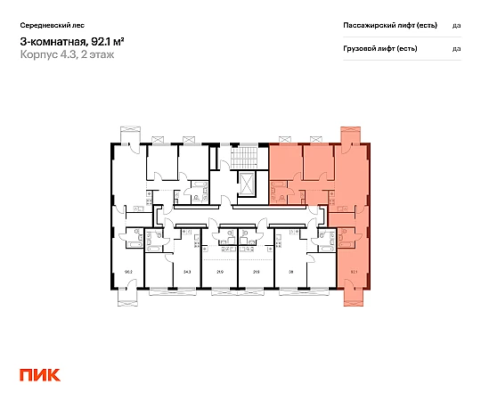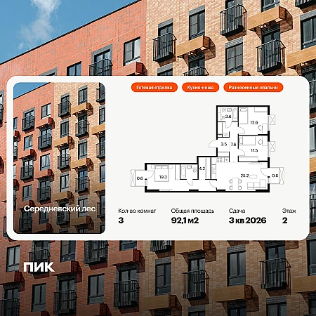 Продаётся 3-комн.квартира площадью 92.10 кв.м на 2 этаже 9 этажного дома (Корпус 4.3, секция 5) проекта ПИК Середневский лес. Светлый просторный подъезд на уровне земли, функциональная планировка, большие окна, с отделкой.