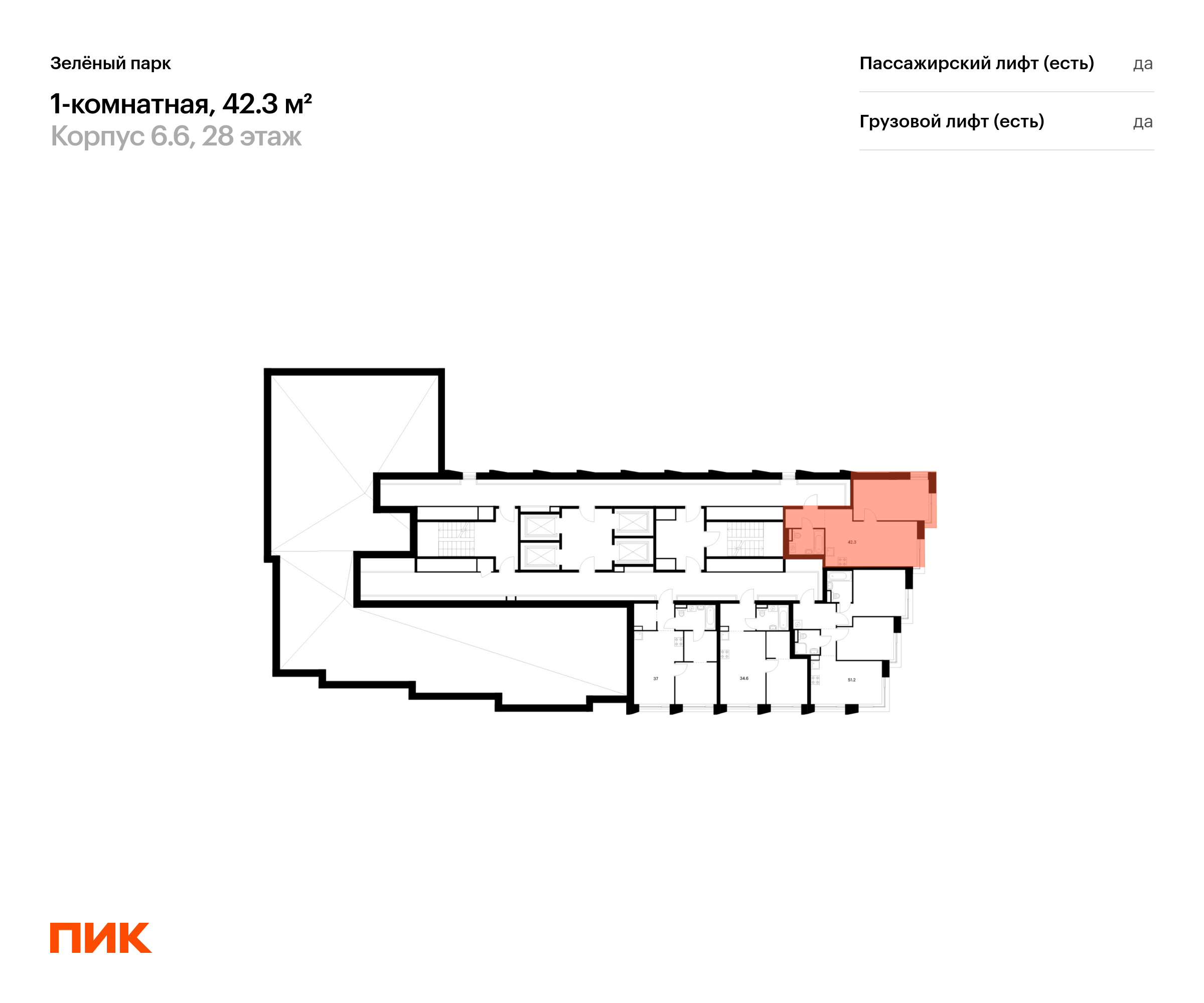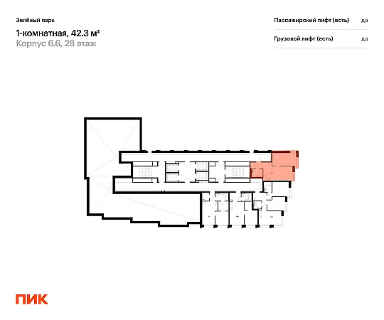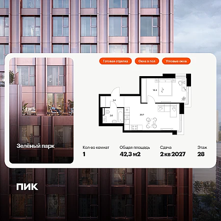 Продаётся 1-комн.квартира площадью 42.30 кв.м на 28 этаже 28 этажного дома (Корпус 6.6, секция 5) проекта ПИК Зелёный парк. Светлый просторный подъезд на уровне земли, функциональная планировка, большие окна, с отделкой.