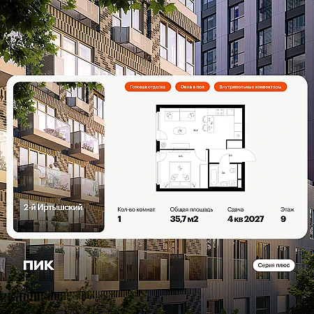 Продаётся 1-комн.квартира площадью 35.70 кв.м на 9 этаже 9 этажного дома (Корпус 1.6, секция 6) проекта ПИК 2-й Иртышский. Светлый просторный подъезд на уровне земли, функциональная планировка, большие окна, с отделкой.