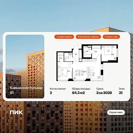 Купить 2к квартиру 64 м² в ЖК Кавказский бульвар 51