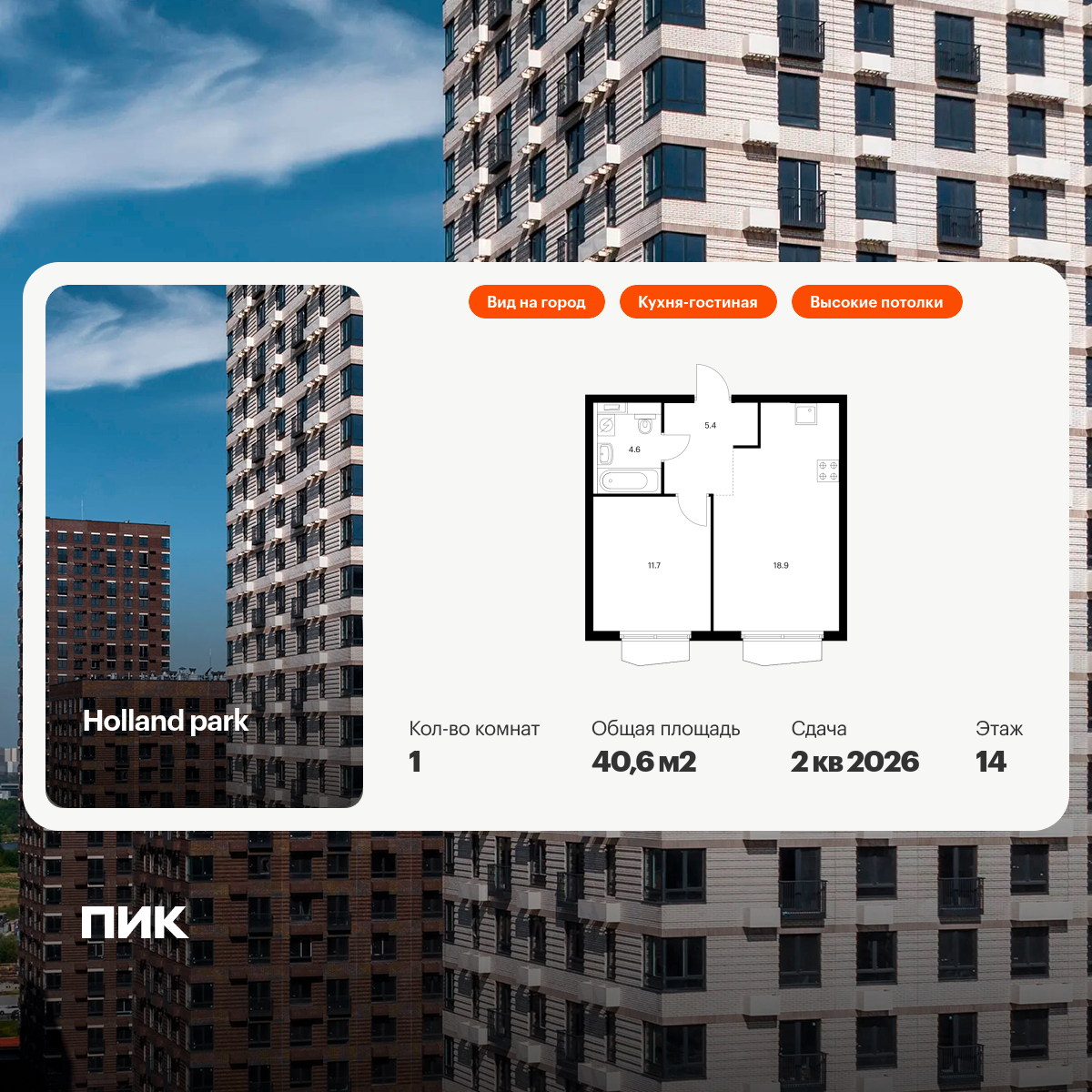 Продаётся 1-комн.квартира площадью 40.60 кв.м на 14 этаже 14 этажного дома (Корпус 8, секция 5) проекта ПИК Holland park. Светлый просторный подъезд на уровне земли, функциональная планировка, большие окна.