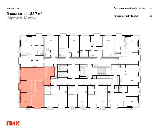 Продаётся 3-комн.квартира площадью 88.70 кв.м на 13 этаже 14 этажного дома (Корпус 8, секция 3) проекта ПИК Holland park. Светлый просторный подъезд на уровне земли, функциональная планировка, большие окна.