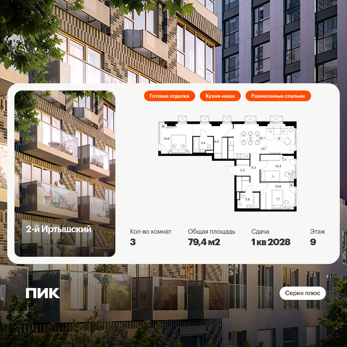 Продаётся 3-комн.квартира площадью 79.40 кв.м на 9 этаже 9 этажного дома (Корпус 1.6, секция 6) проекта ПИК 2-й Иртышский. Светлый просторный подъезд на уровне земли, функциональная планировка, большие окна, с отделкой.