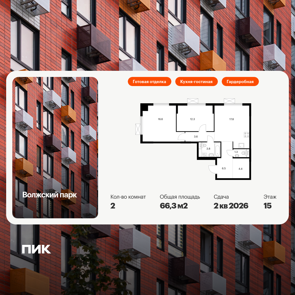 Продаётся 2-комн.квартира площадью 66.30 кв.м на 15 этаже 24 этажного дома (Корпус 6.1, секция 1) проекта ПИК Волжский парк. Светлый просторный подъезд на уровне земли, функциональная планировка, большие окна, с отделкой.