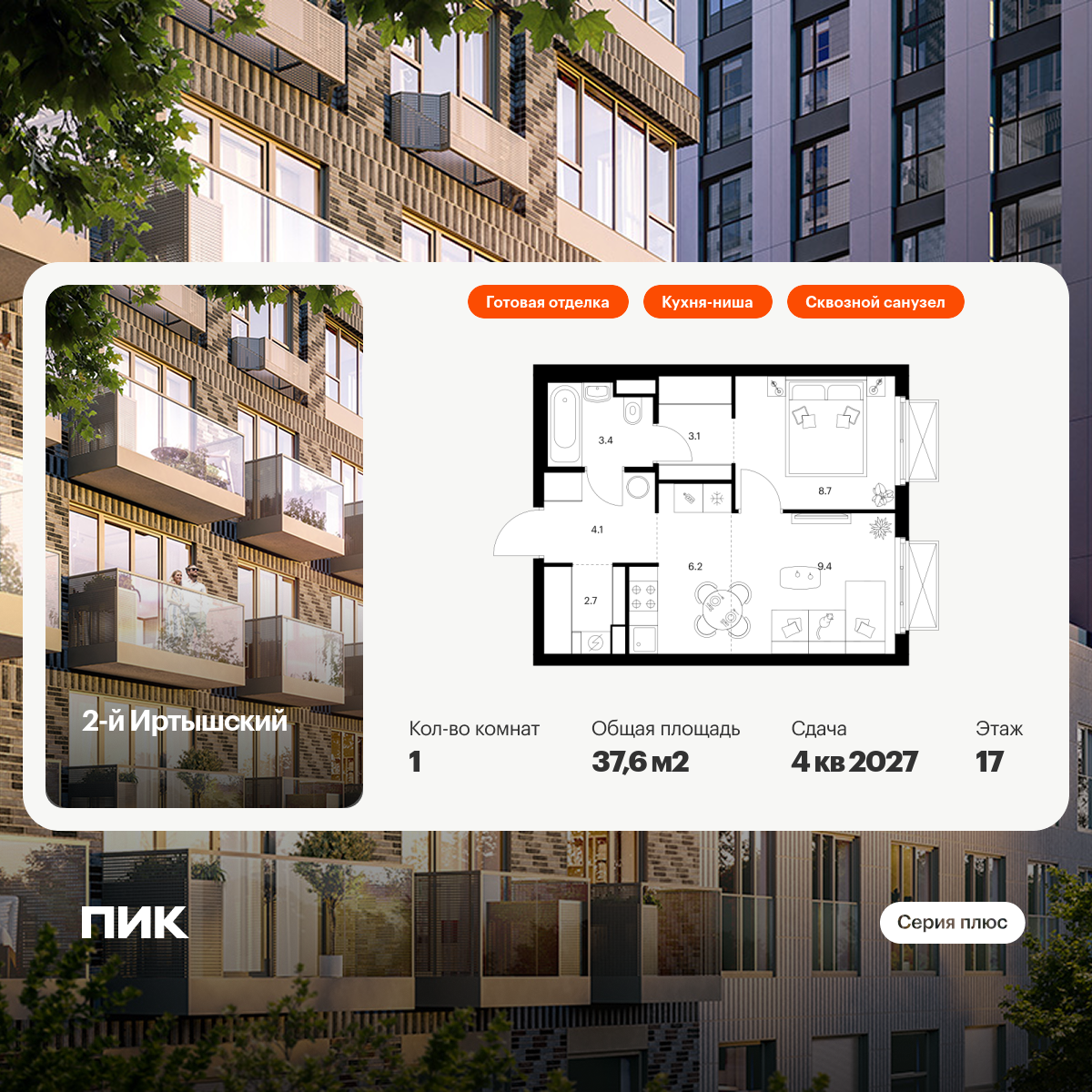Продаётся 1-комн.квартира площадью 37.60 кв.м на 17 этаже 20 этажного дома (Корпус 1.7, секция 7) проекта ПИК 2-й Иртышский. Светлый просторный подъезд на уровне земли, функциональная планировка, большие окна, с отделкой.