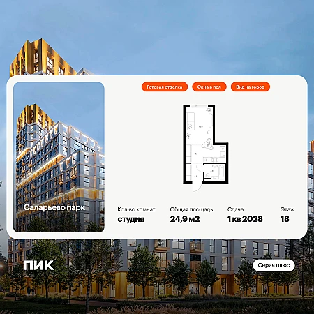 Продаётся квартира-студия площадью 24.90 кв.м на 18 этаже 18 этажного дома (Корпус 74.1, секция 1) проекта ПИК Саларьево парк. Светлый просторный подъезд на уровне земли, функциональная планировка, большие окна, с отделкой.