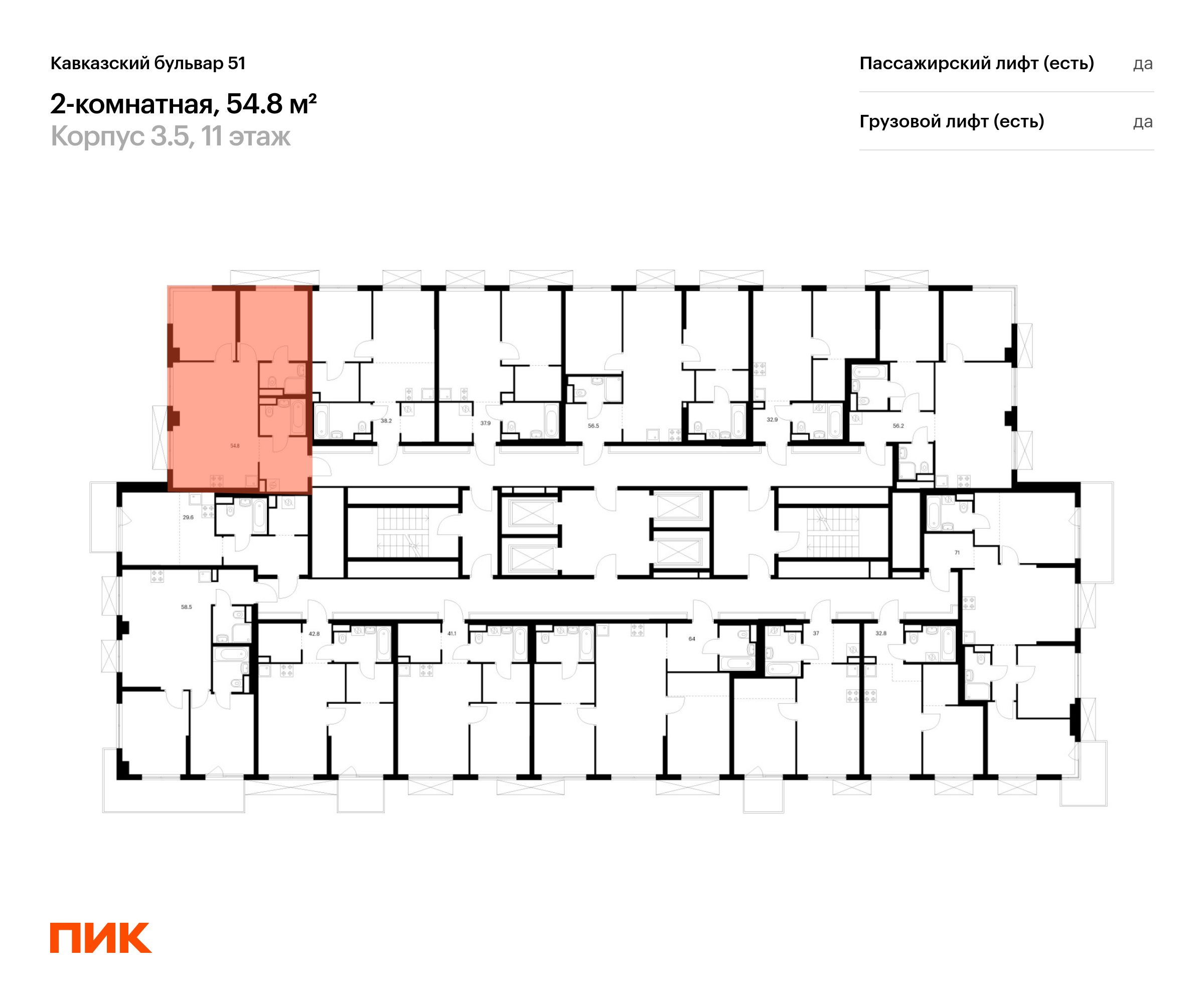 Продаётся 2-комн.квартира площадью 54.80 кв.м на 11 этаже 24 этажного дома (Корпус 3.5, секция 2) проекта ПИК Кавказский бульвар 51. Светлый просторный подъезд на уровне земли, функциональная планировка, большие окна, с отделкой.