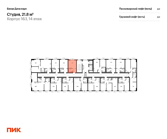 Продаётся квартира-студия площадью 21.80 кв.м на 14 этаже 15 этажного дома (Корпус 16.1, секция 4) проекта ПИК Белая Дача парк. Светлый просторный подъезд на уровне земли, функциональная планировка, большие окна, с отделкой.