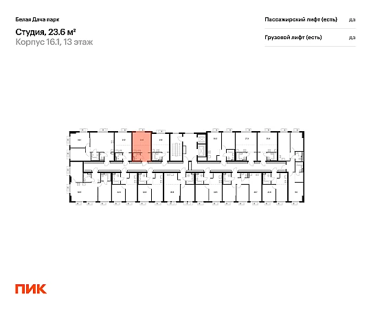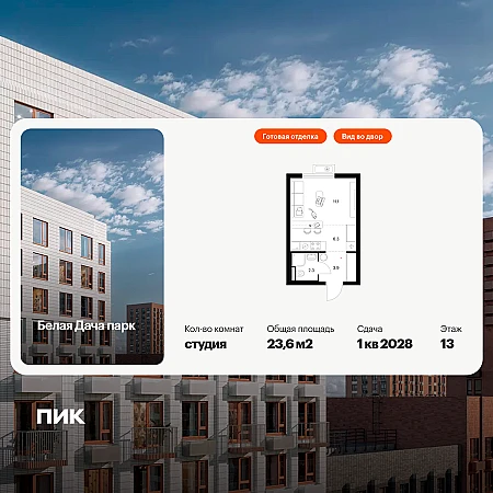 Продаётся квартира-студия площадью 23.60 кв.м на 13 этаже 15 этажного дома (Корпус 16.1, секция 4) проекта ПИК Белая Дача парк. Светлый просторный подъезд на уровне земли, функциональная планировка, большие окна, с отделкой.
