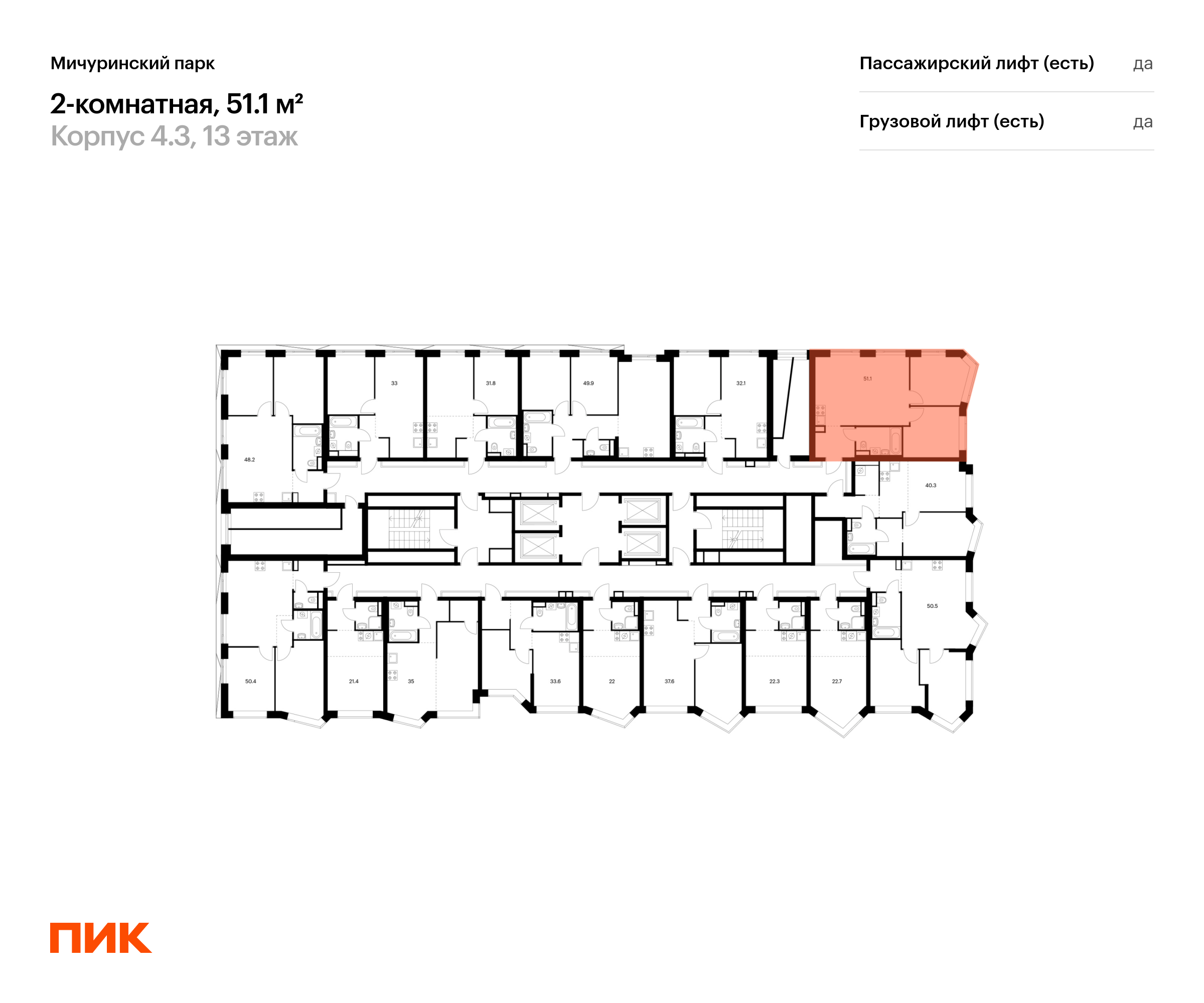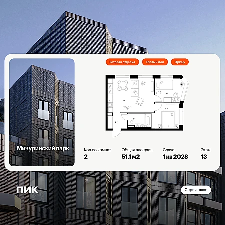 Продаётся 2-комн.квартира площадью 51.10 кв.м на 13 этаже 31 этажного дома (Корпус 4.3, секция 2) проекта ПИК Мичуринский парк. Светлый просторный подъезд на уровне земли, функциональная планировка, большие окна, с отделкой.