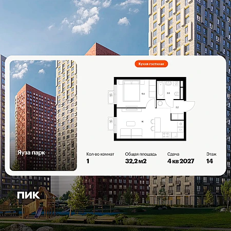 Продаётся 1-комн.квартира площадью 32.20 кв.м на 14 этаже 24 этажного дома (Корпус 12, секция 1) проекта ПИК Яуза парк. Светлый просторный подъезд на уровне земли, функциональная планировка, большие окна, с отделкой.