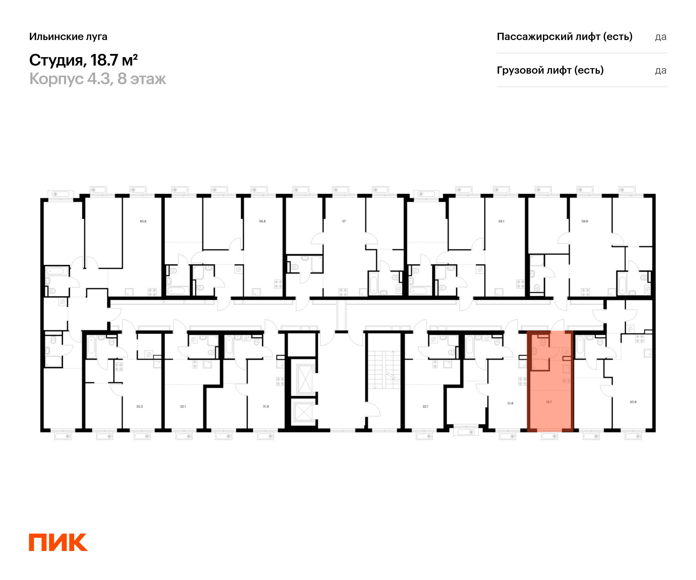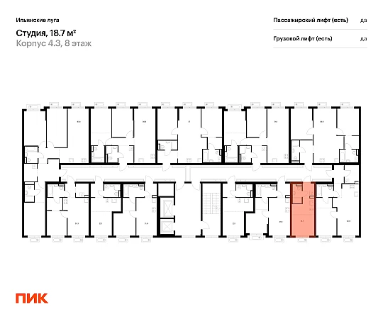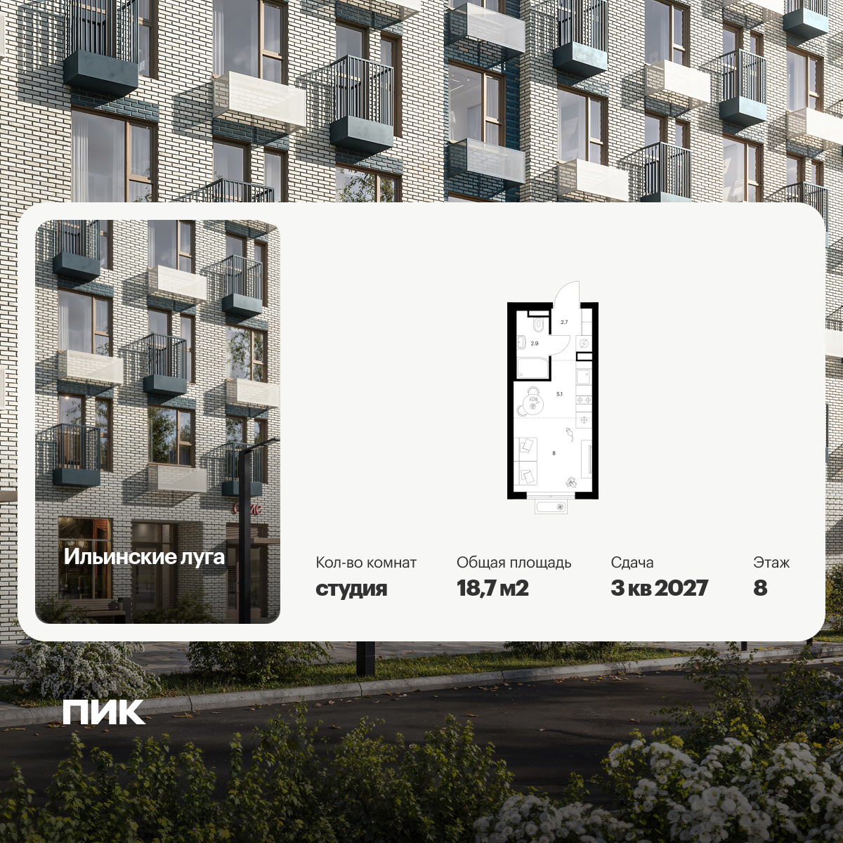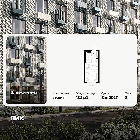 Продаётся квартира-студия площадью 18.70 кв.м на 8 этаже 9 этажного дома (Корпус 4.3, секция 3) проекта ПИК Ильинские луга. Светлый просторный подъезд на уровне земли, функциональная планировка, большие окна, с отделкой.