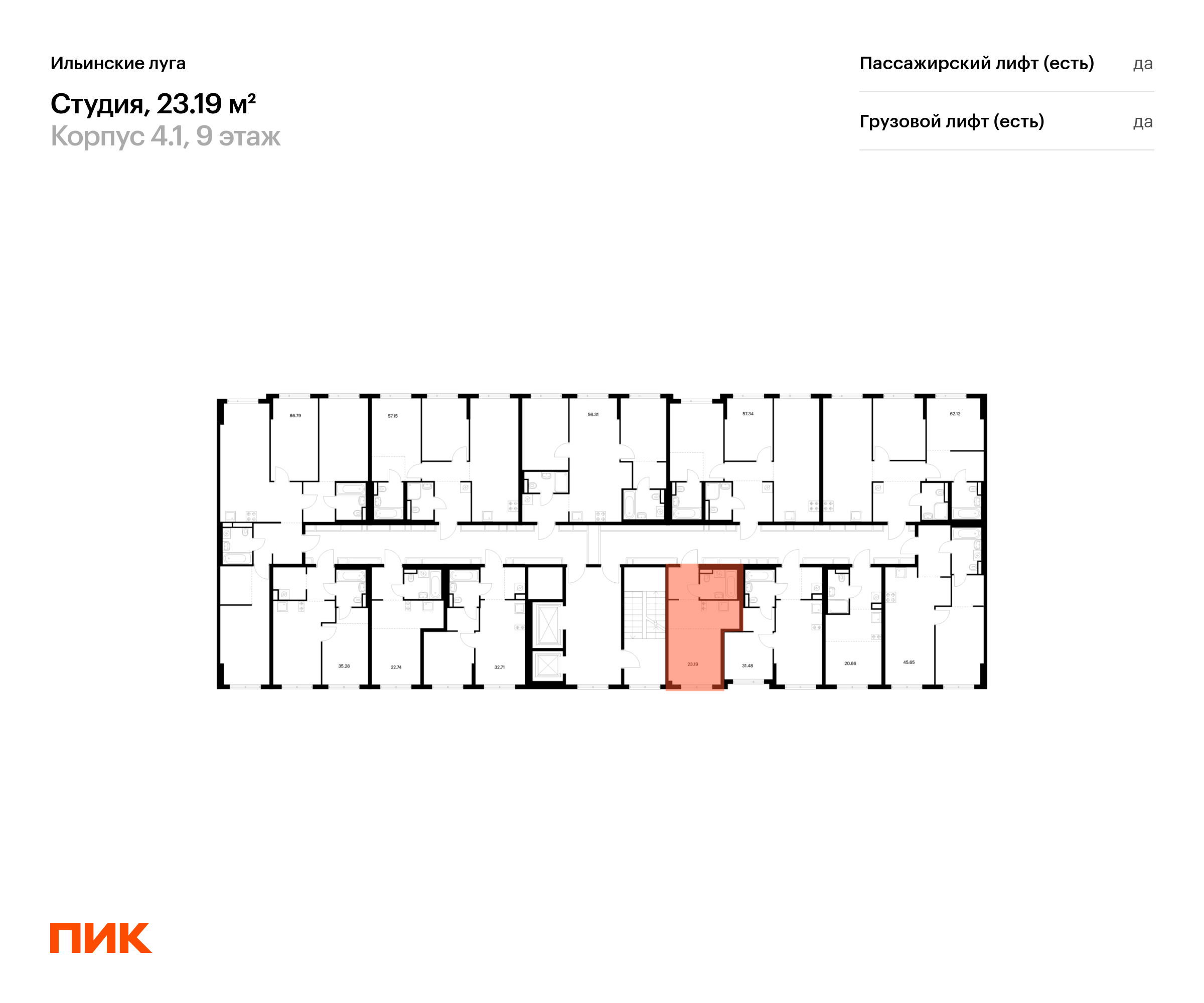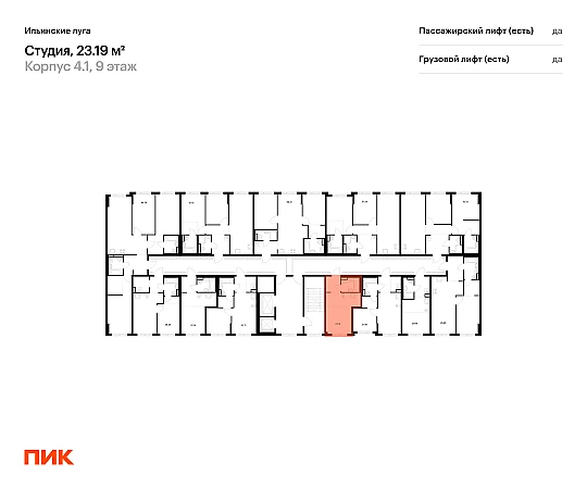 Продаётся квартира-студия площадью 23.19 кв.м на 9 этаже 9 этажного дома (Корпус 4.1, секция 3) проекта ПИК Ильинские луга. Светлый просторный подъезд на уровне земли, функциональная планировка, большие окна, с отделкой.