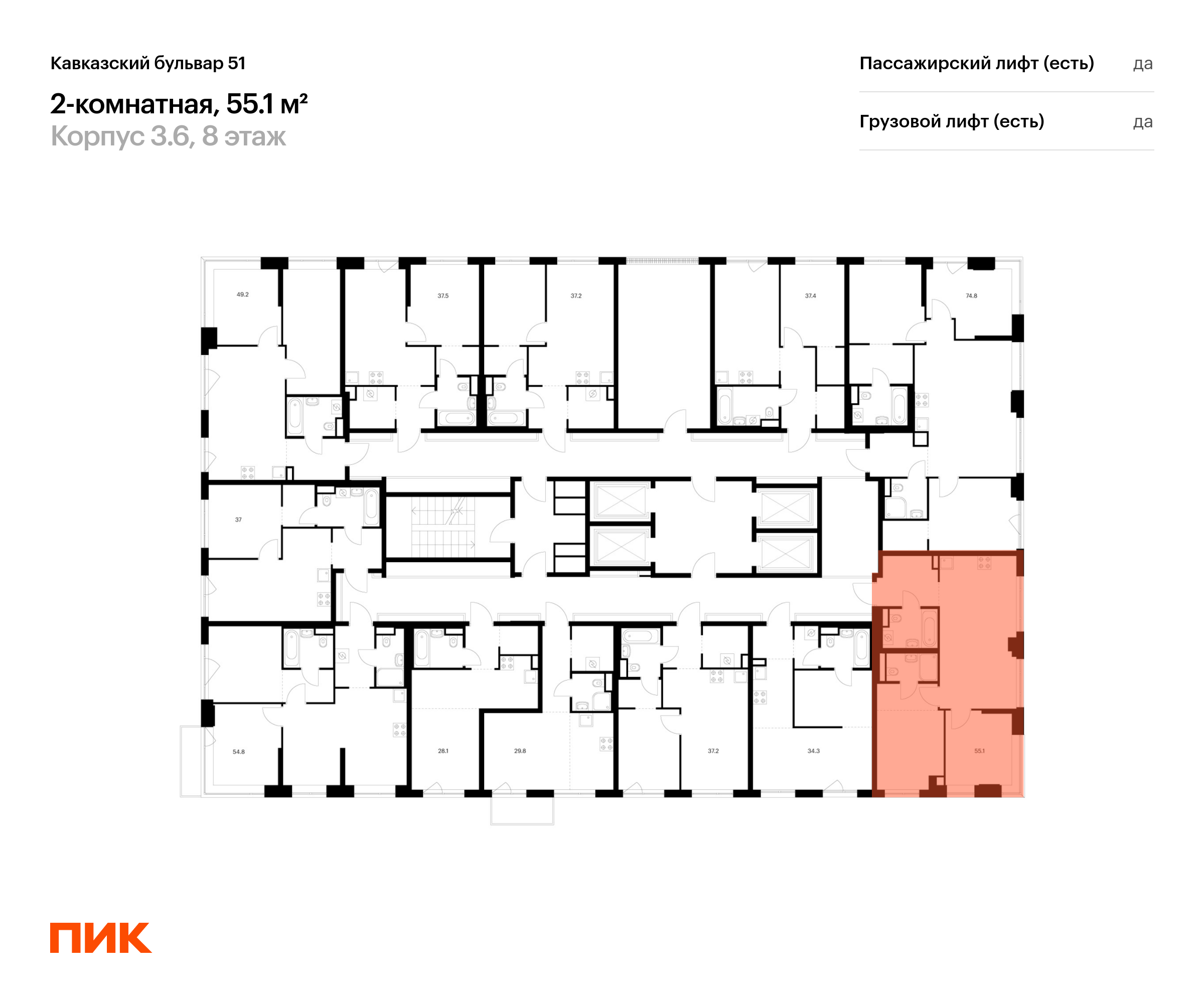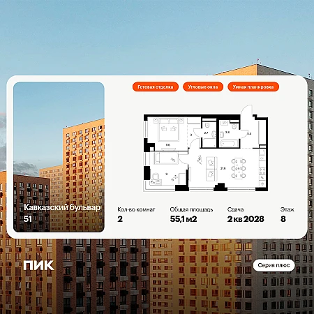 Продаётся 2-комн.квартира площадью 55.10 кв.м на 8 этаже 32 этажного дома (Корпус 3.6, секция 3) проекта ПИК Кавказский бульвар 51. Светлый просторный подъезд на уровне земли, функциональная планировка, большие окна, с отделкой.