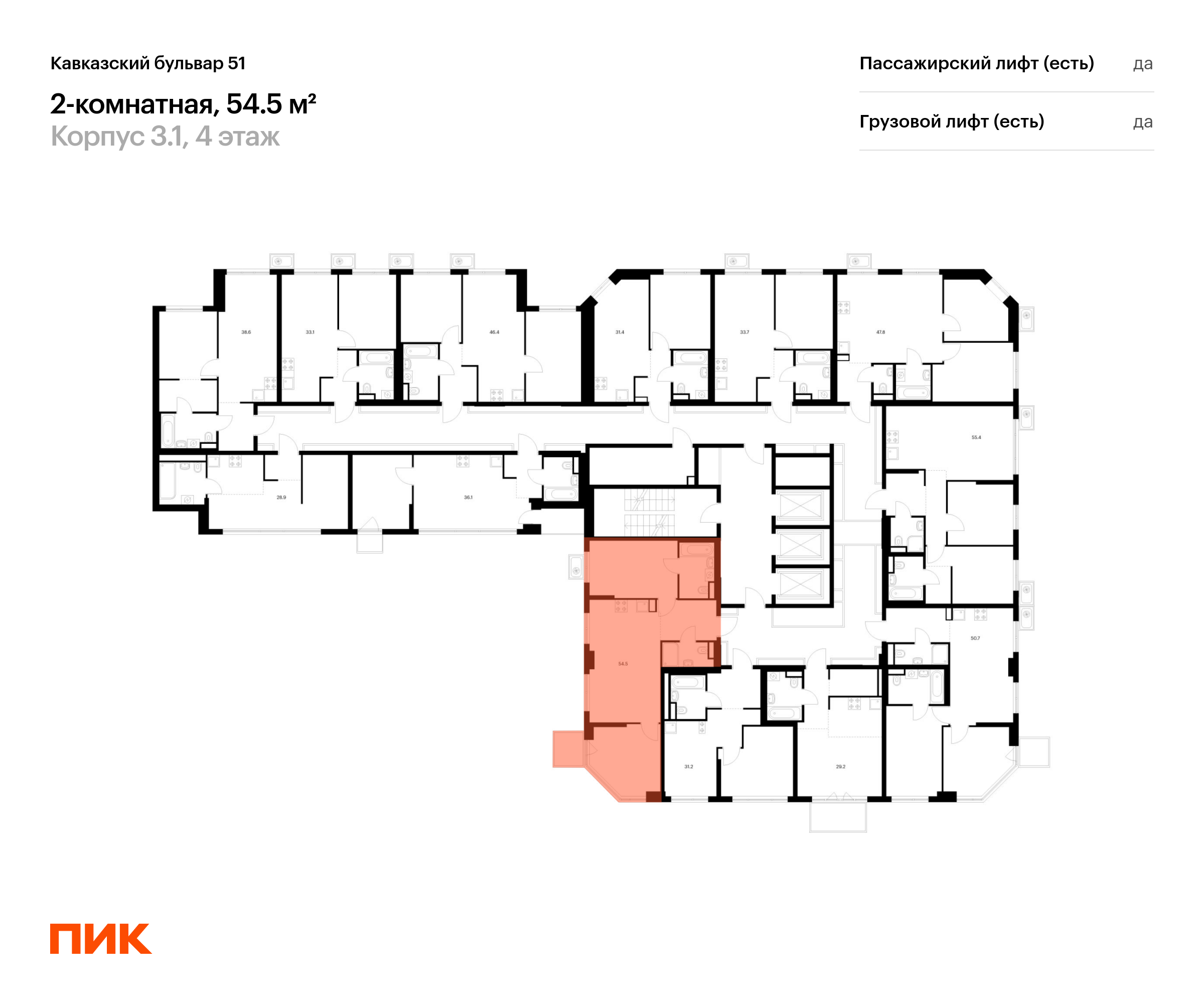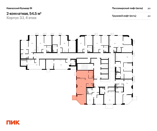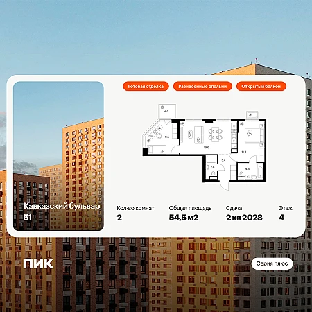Продаётся 2-комн.квартира площадью 54.50 кв.м на 4 этаже 23 этажного дома (Корпус 3.1, секция 1) проекта ПИК Кавказский бульвар 51. Светлый просторный подъезд на уровне земли, функциональная планировка, большие окна, с отделкой.