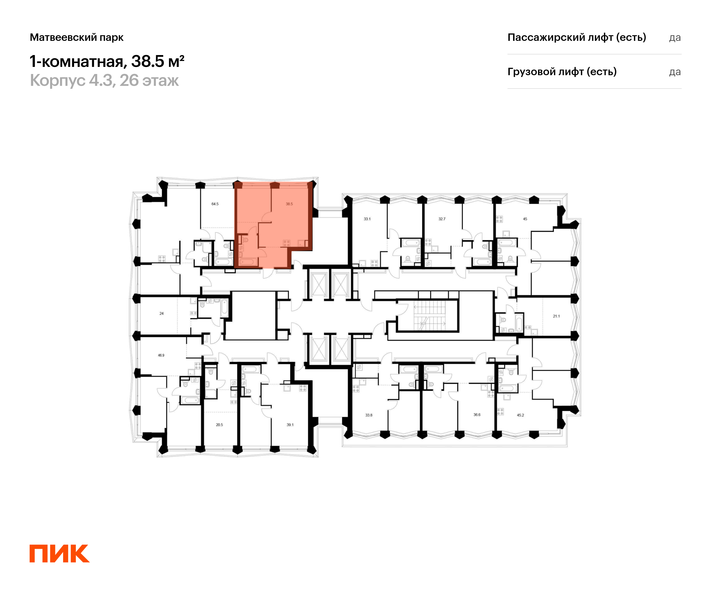 Продаётся 1-комн.квартира площадью 38.50 кв.м на 26 этаже 31 этажного дома (Корпус 4.3, секция 3) проекта ПИК Матвеевский парк. Светлый просторный подъезд на уровне земли, функциональная планировка, большие окна, с отделкой.
