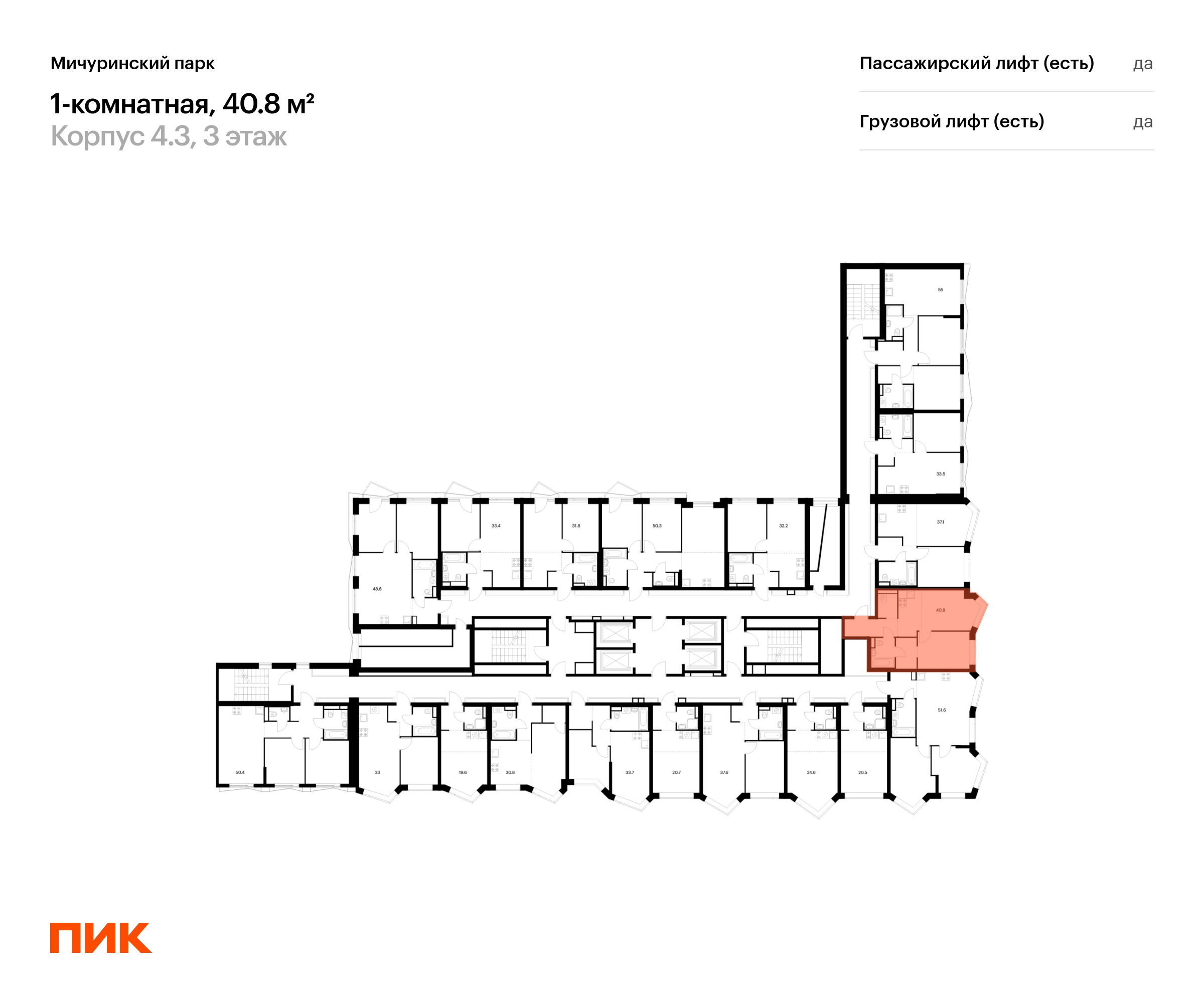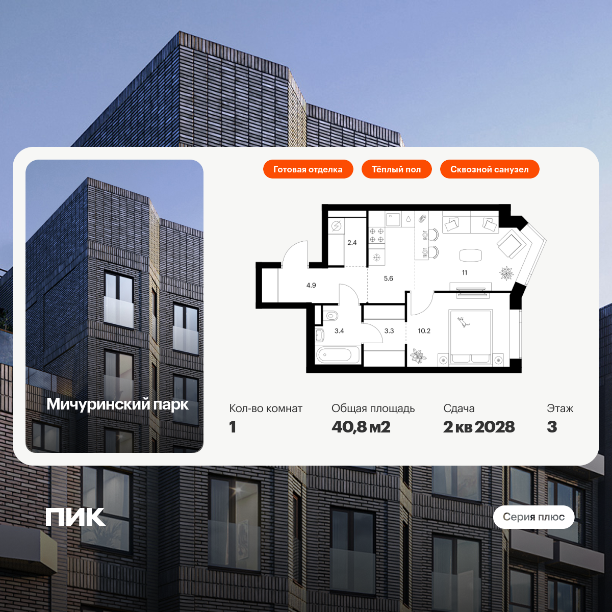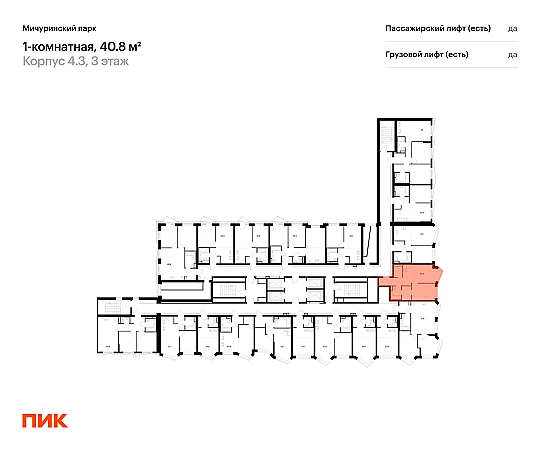 Продаётся 1-комн.квартира площадью 40.80 кв.м на 3 этаже 31 этажного дома (Корпус 4.3, секция 2) проекта ПИК Мичуринский парк. Светлый просторный подъезд на уровне земли, функциональная планировка, большие окна, с отделкой.