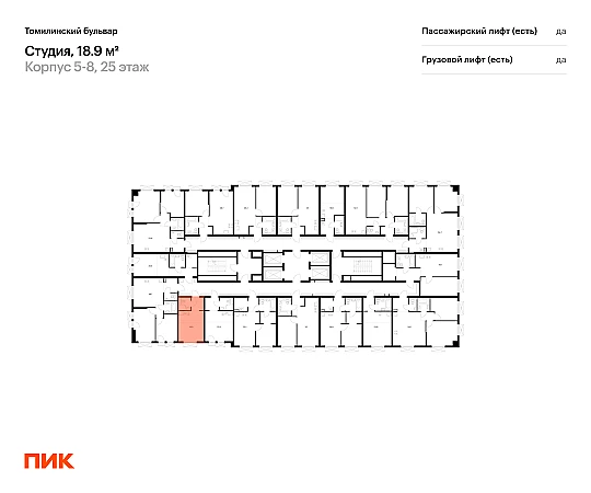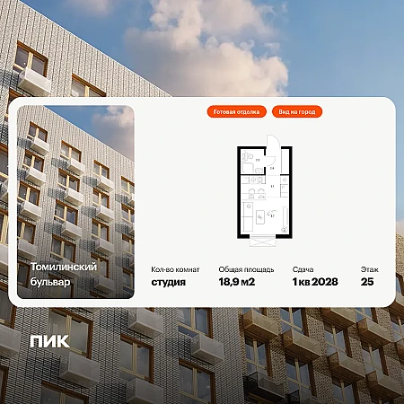Продаётся квартира-студия площадью 18.90 кв.м на 25 этаже 25 этажного дома (Корпус 5-8, секция 1) проекта ПИК Томилинский бульвар. Светлый просторный подъезд на уровне земли, функциональная планировка, большие окна, с отделкой.