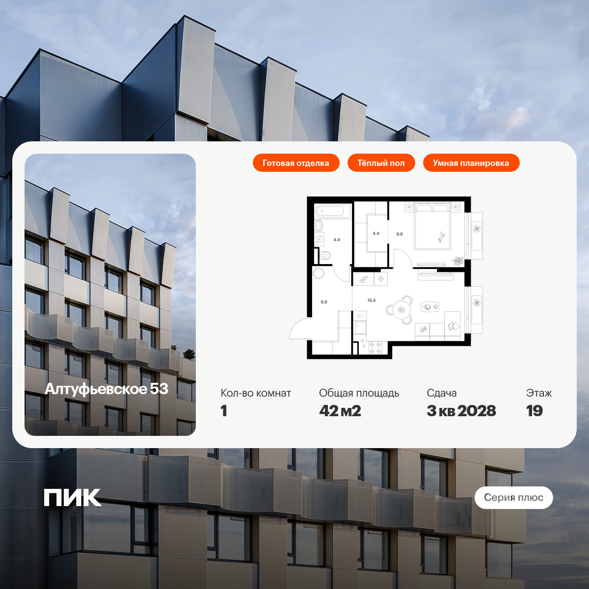 Продаётся 1-комн.квартира площадью 42.00 кв.м на 19 этаже 22 этажного дома (Корпус 1.1, секция 1) проекта ПИК Алтуфьевское 53. Светлый просторный подъезд на уровне земли, функциональная планировка, большие окна, с отделкой.