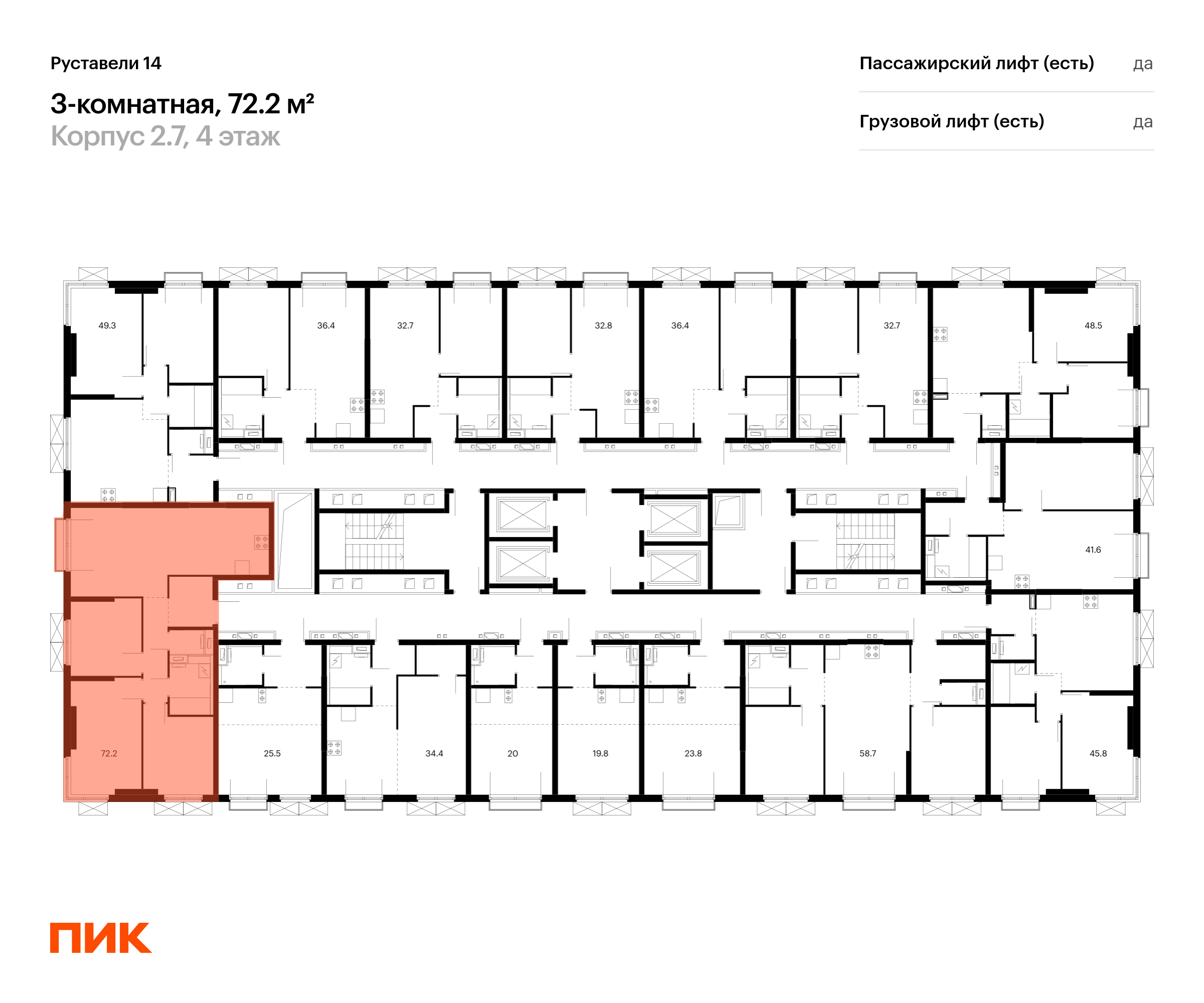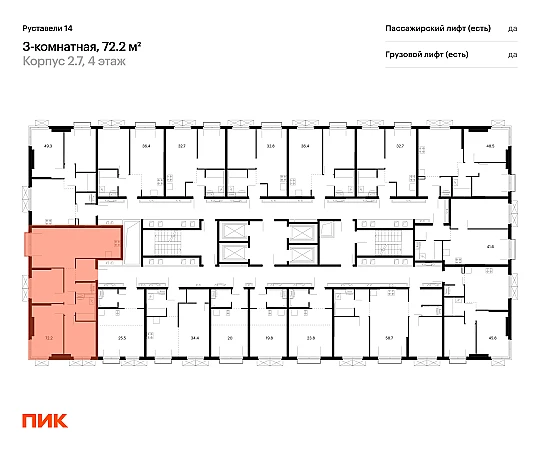 Продаётся 3-комн.квартира площадью 72.20 кв.м на 4 этаже 33 этажного дома (Корпус 2.7, секция 3) проекта ПИК Руставели 14. Светлый просторный подъезд на уровне земли, функциональная планировка, большие окна, с отделкой.