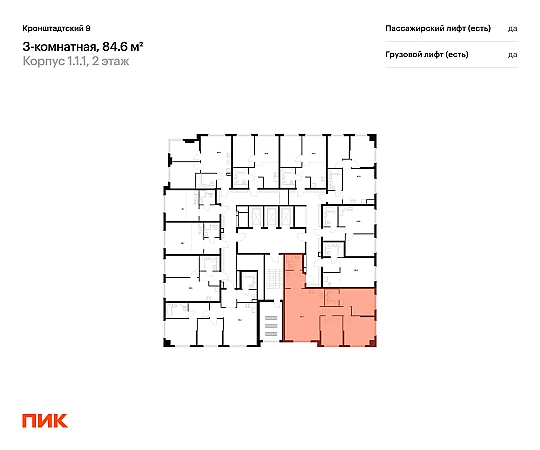 Продаётся 3-комн.квартира площадью 84.60 кв.м на 2 этаже 12 этажного дома (Корпус 1.1.1, секция 1) проекта ПИК Кронштадтский 9. Светлый просторный подъезд на уровне земли, функциональная планировка, большие окна, с отделкой.