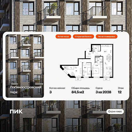 Продаётся 3-комн.квартира площадью 84.50 кв.м на 12 этаже 17 этажного дома (Корпус 2.3, секция 2) проекта ПИК Лосиноостровский парк. Светлый просторный подъезд на уровне земли, функциональная планировка, большие окна.
