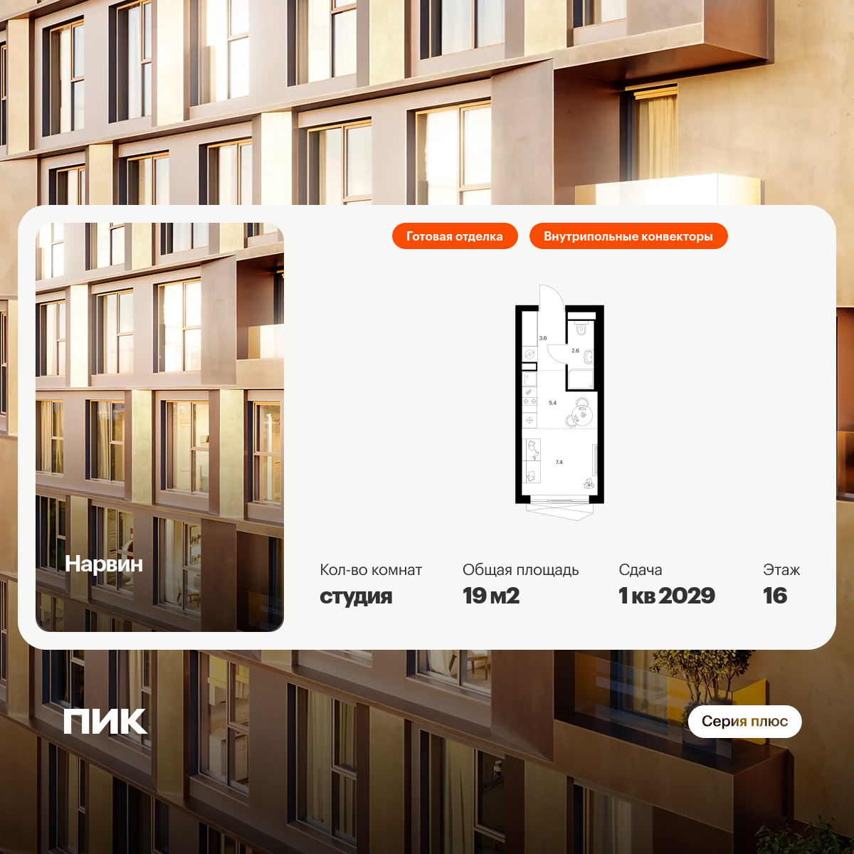 Продаётся квартира-студия площадью 19.00 кв.м на 16 этаже 38 этажного дома (Корпус 1.3, секция 3) проекта ПИК Нарвин. Светлый просторный подъезд на уровне земли, функциональная планировка, большие окна, с отделкой.