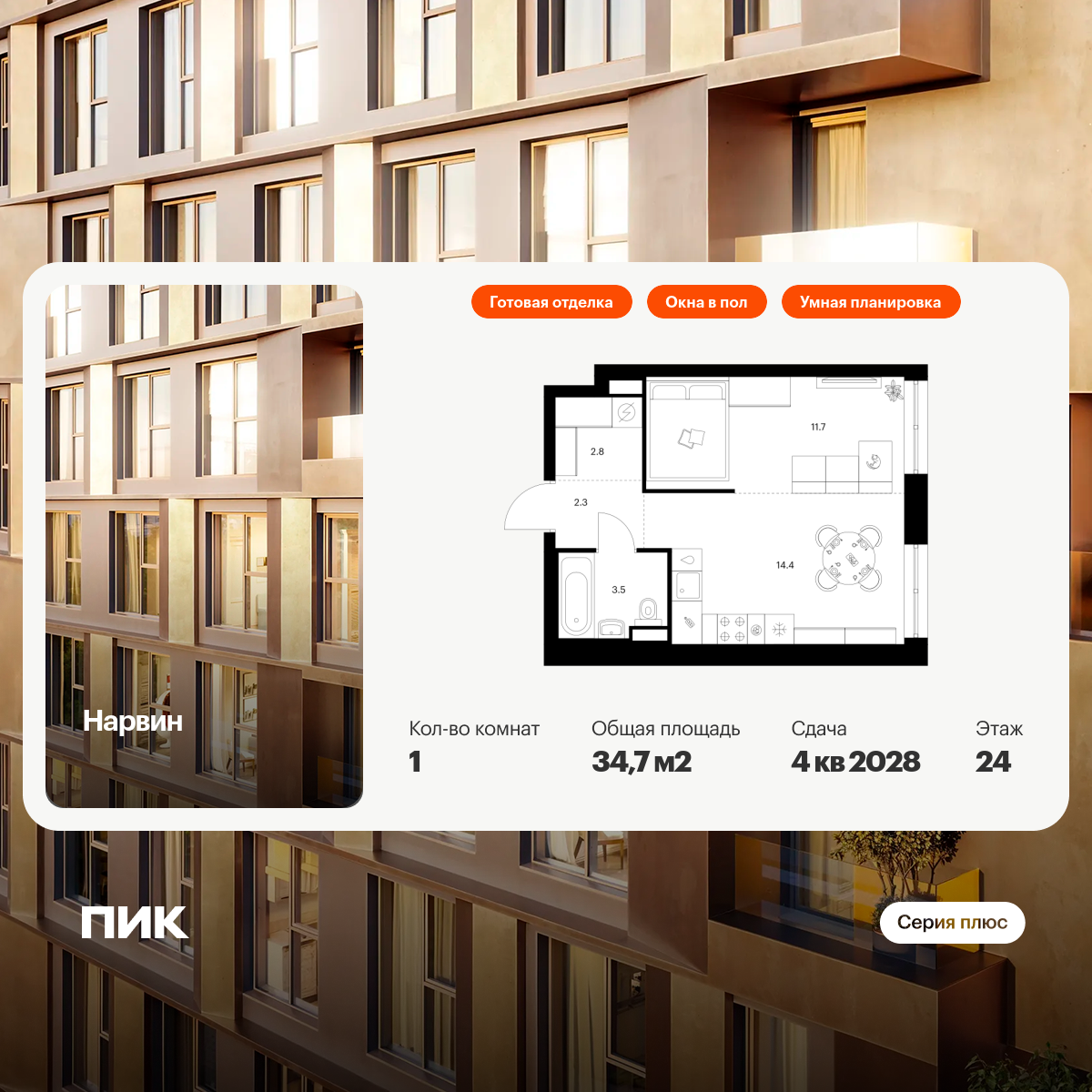 Продаётся 1-комн.квартира площадью 34.70 кв.м на 24 этаже 38 этажного дома (Корпус 1.3, секция 3) проекта ПИК Нарвин. Светлый просторный подъезд на уровне земли, функциональная планировка, большие окна, с отделкой.