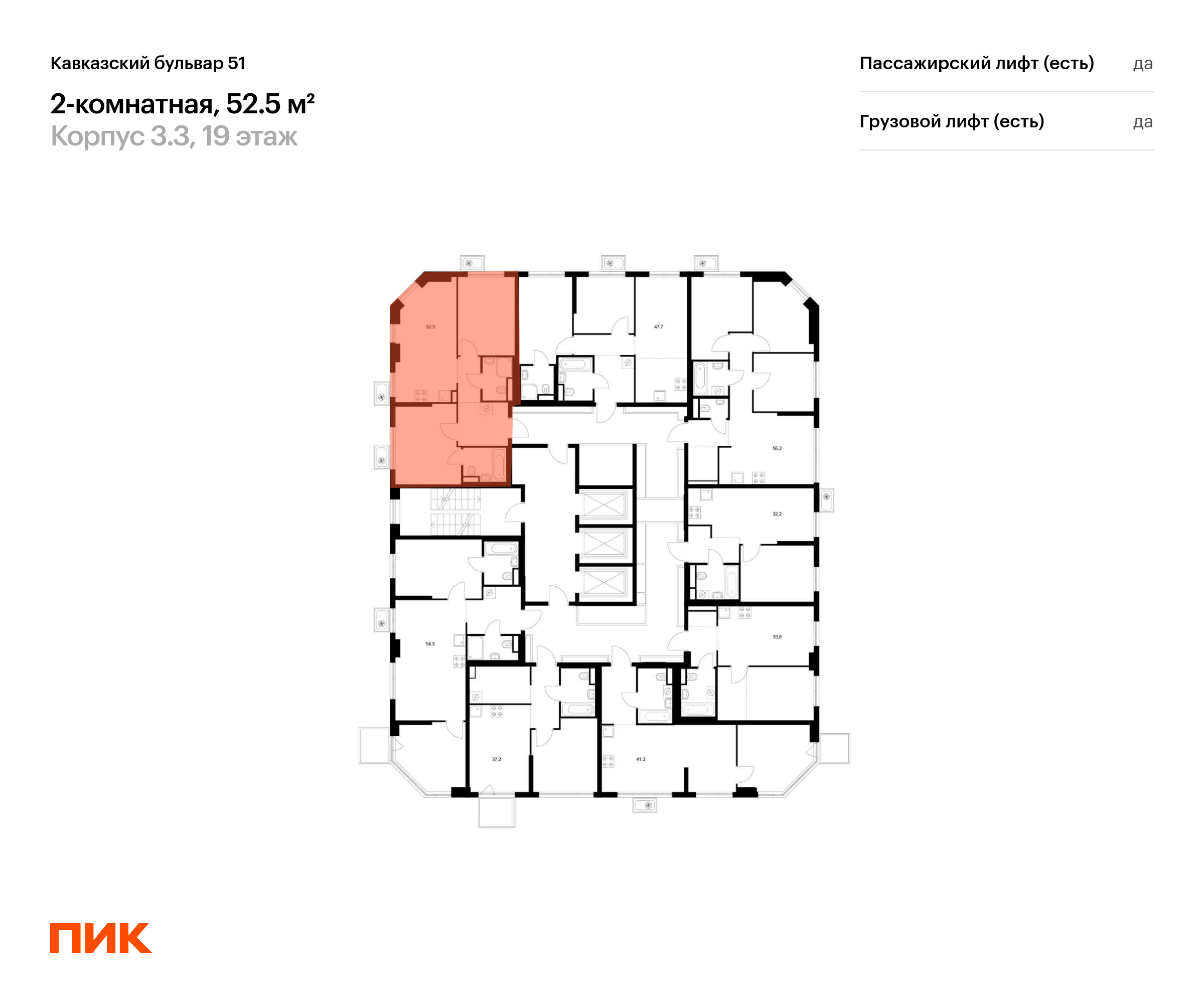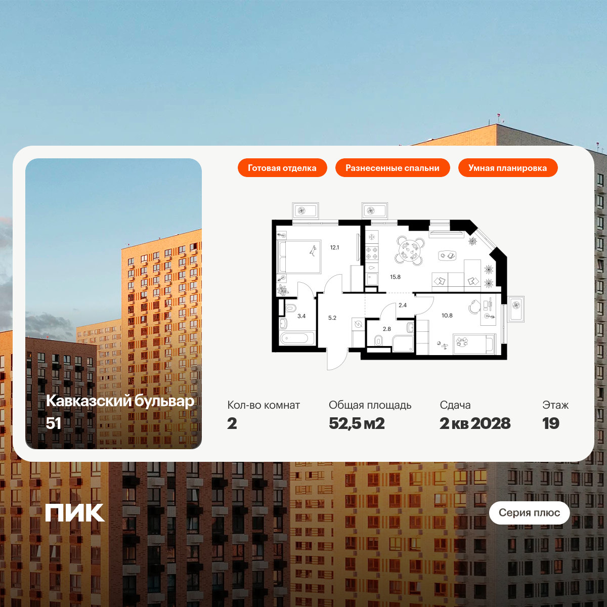 Продаётся 2-комн.квартира площадью 52.50 кв.м на 19 этаже 23 этажного дома (Корпус 3.3, секция 3) проекта ПИК Кавказский бульвар 51. Светлый просторный подъезд на уровне земли, функциональная планировка, большие окна, с отделкой.