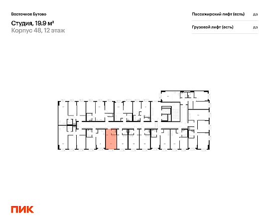 Продаётся квартира-студия площадью 19.90 кв.м на 12 этаже 17 этажного дома (Корпус 48, секция 2) проекта ПИК Восточное Бутово. Светлый просторный подъезд на уровне земли, функциональная планировка, большие окна, с отделкой.