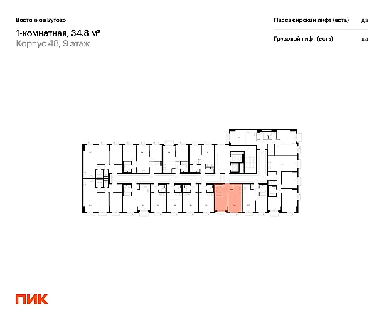 Продаётся 1-комн.квартира площадью 34.80 кв.м на 9 этаже 17 этажного дома (Корпус 48, секция 2) проекта ПИК Восточное Бутово. Светлый просторный подъезд на уровне земли, функциональная планировка, большие окна, с отделкой.
