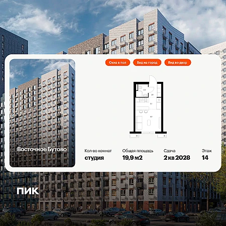 Продаётся квартира-студия площадью 21.80 кв.м на 13 этаже 25 этажного дома (Корпус 47, секция 3) проекта ПИК Восточное Бутово. Светлый просторный подъезд на уровне земли, функциональная планировка, большие окна, с отделкой.