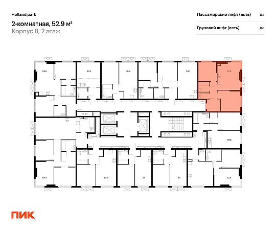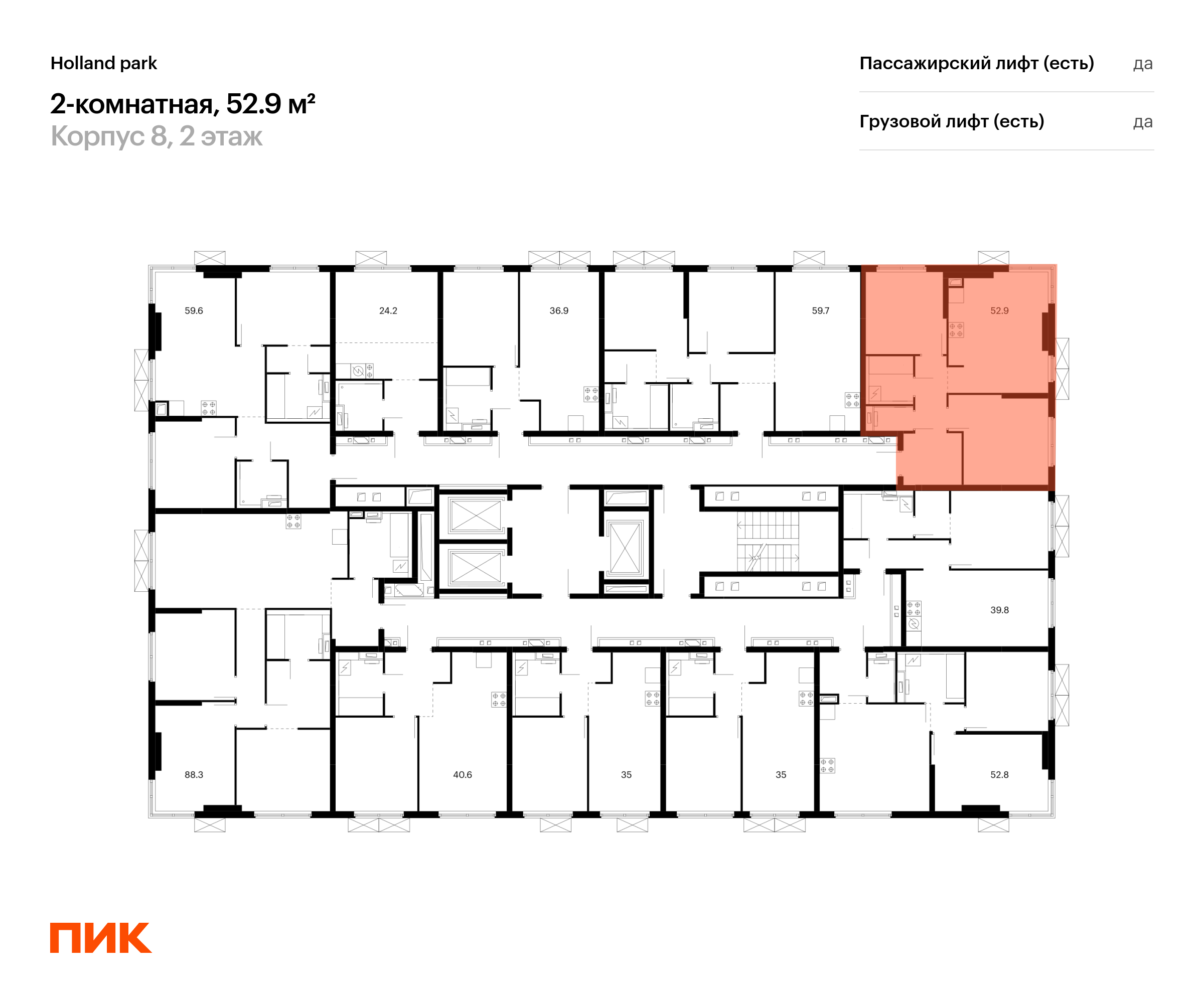 Продаётся 2-комн.квартира площадью 52.90 кв.м на 2 этаже 14 этажного дома (Корпус 8, секция 3) проекта ПИК Holland park. Светлый просторный подъезд на уровне земли, функциональная планировка, большие окна.