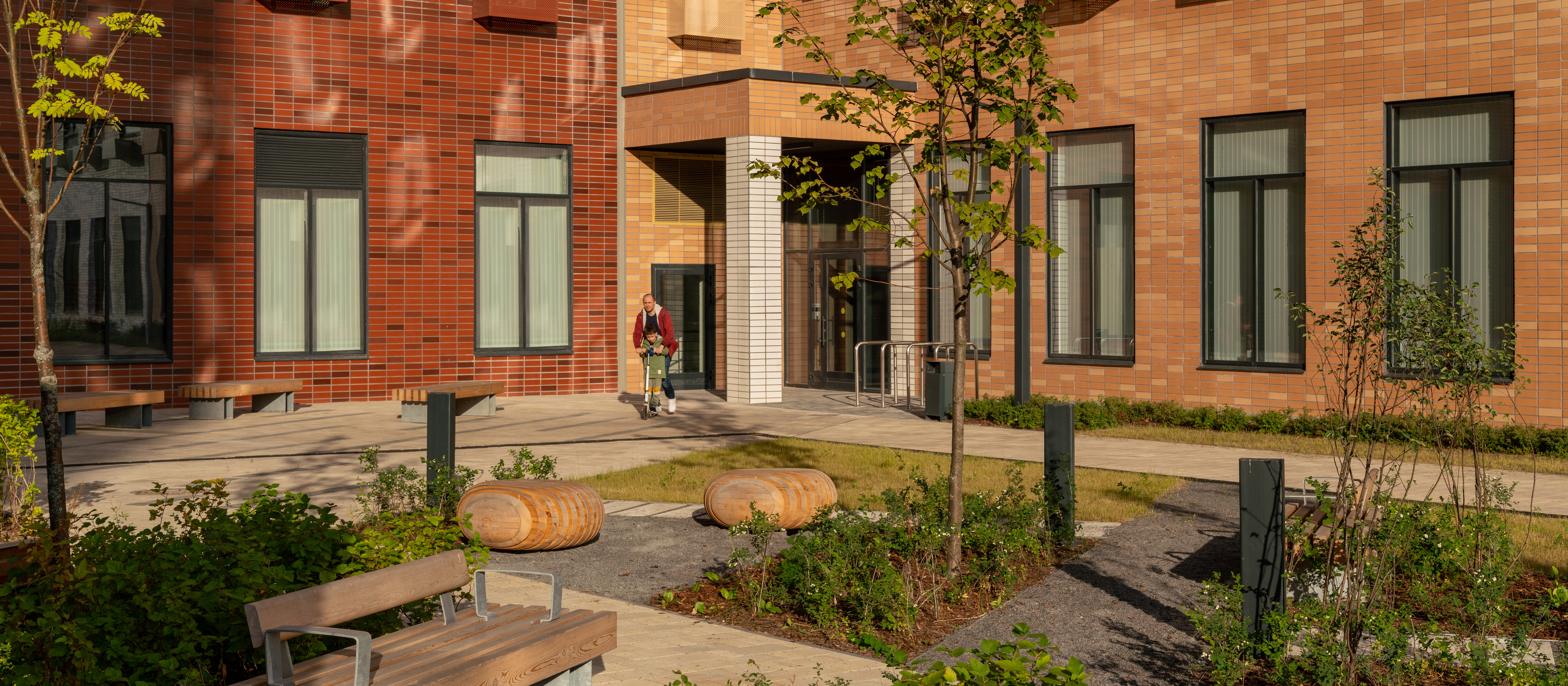 В проекте два жилых блока с подземными паркингами, школа и детский сад. В зелёных дворах-парках будут места для отдыха, современные детские и спортивные площадки. На первых этажах откроются магазины, кафе и другие сервисы — за кофе и свежим хлебом к завтраку можно будет просто спуститься на лифте.