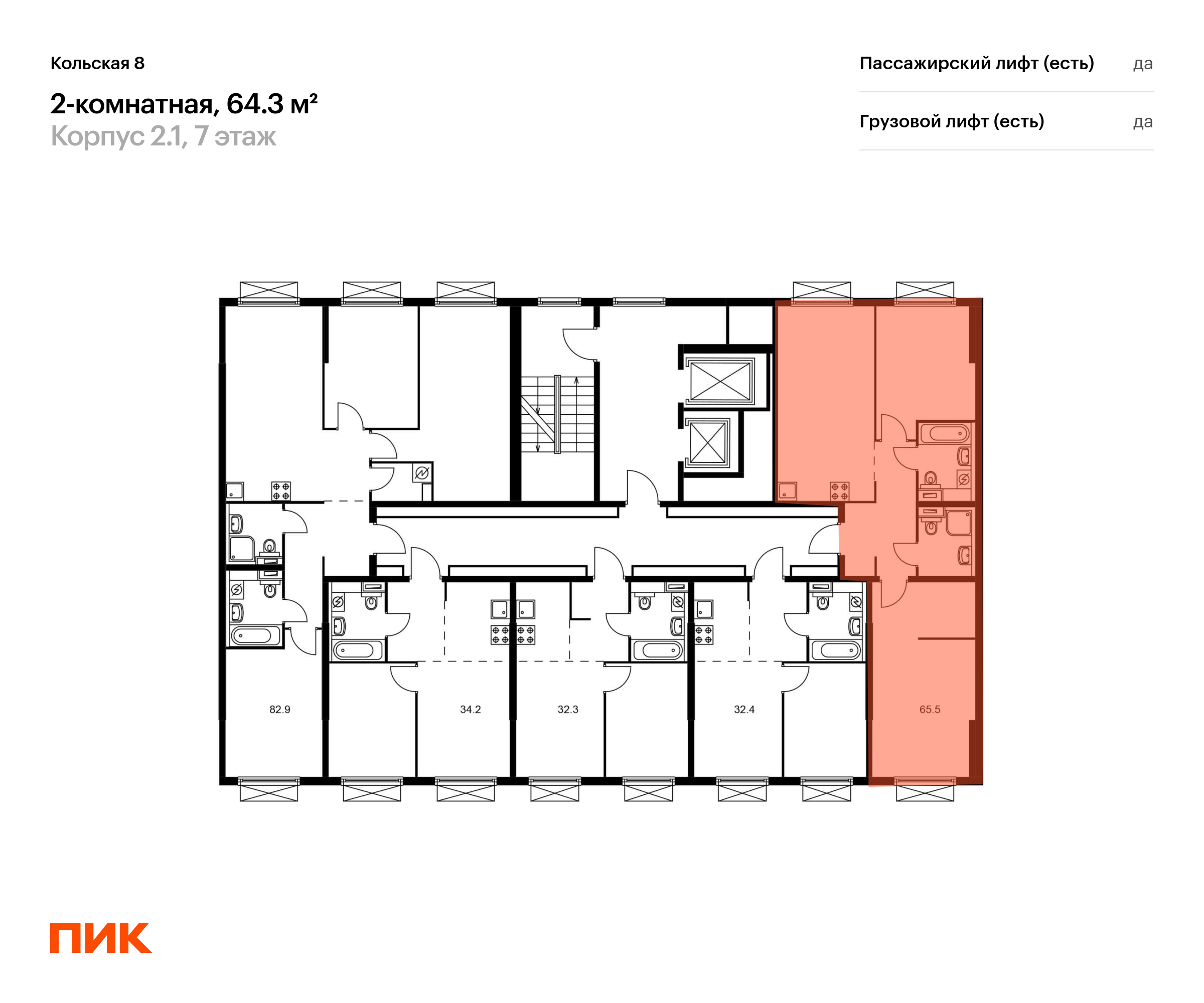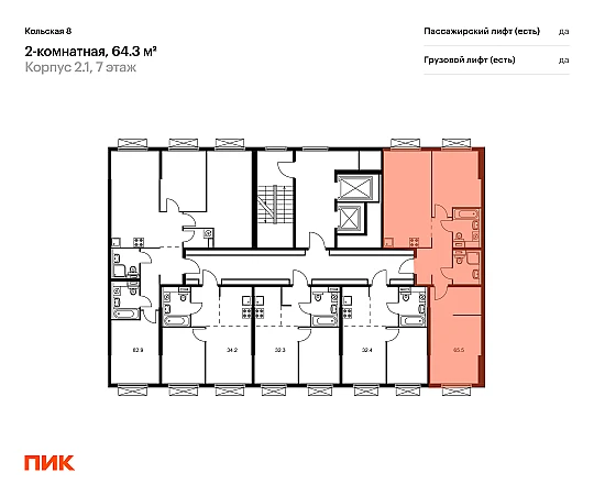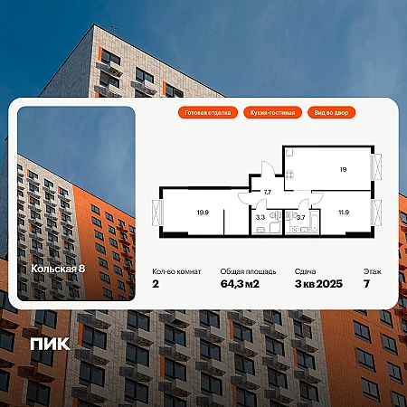 Продаётся 2-комн.квартира площадью 64.30 кв.м на 7 этаже 15 этажного дома (Корпус 2.1, секция 3) проекта ПИК Кольская 8. Светлый просторный подъезд на уровне земли, функциональная планировка, большие окна, с отделкой.