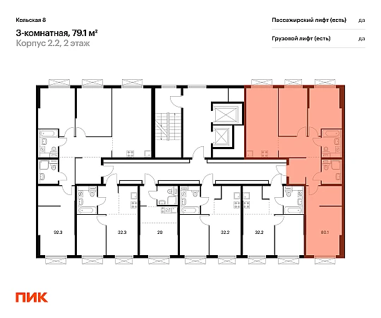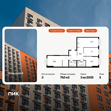 Продаётся 3-комн.квартира площадью 79.10 кв.м на 2 этаже 15 этажного дома (Корпус 2.2, секция 6) проекта ПИК Кольская 8. Светлый просторный подъезд на уровне земли, функциональная планировка, большие окна, с отделкой.