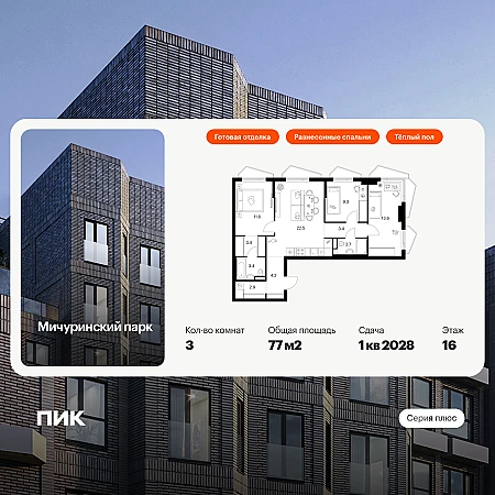 Купить 3к квартиру 77 м² в ЖК Мичуринский парк