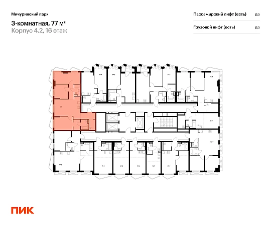 Продаётся 3-комн.квартира площадью 77.00 кв.м на 16 этаже 24 этажного дома (Корпус 4.2, секция 1) проекта ПИК Мичуринский парк. Светлый просторный подъезд на уровне земли, функциональная планировка, большие окна, с отделкой.
