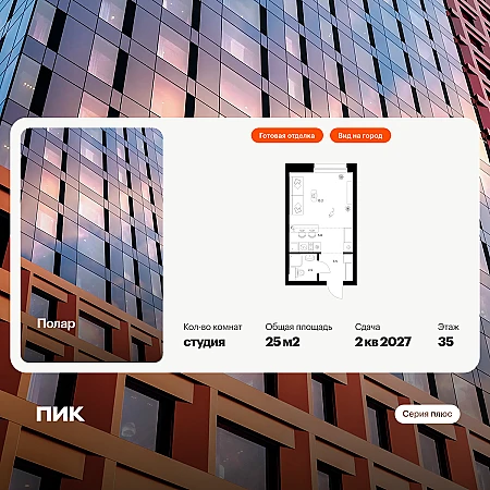 Продаётся квартира-студия площадью 25.00 кв.м на 35 этаже 53 этажного дома (Корпус 1.4, секция 1) проекта ПИК Полар. Светлый просторный подъезд на уровне земли, функциональная планировка, большие окна, с отделкой.