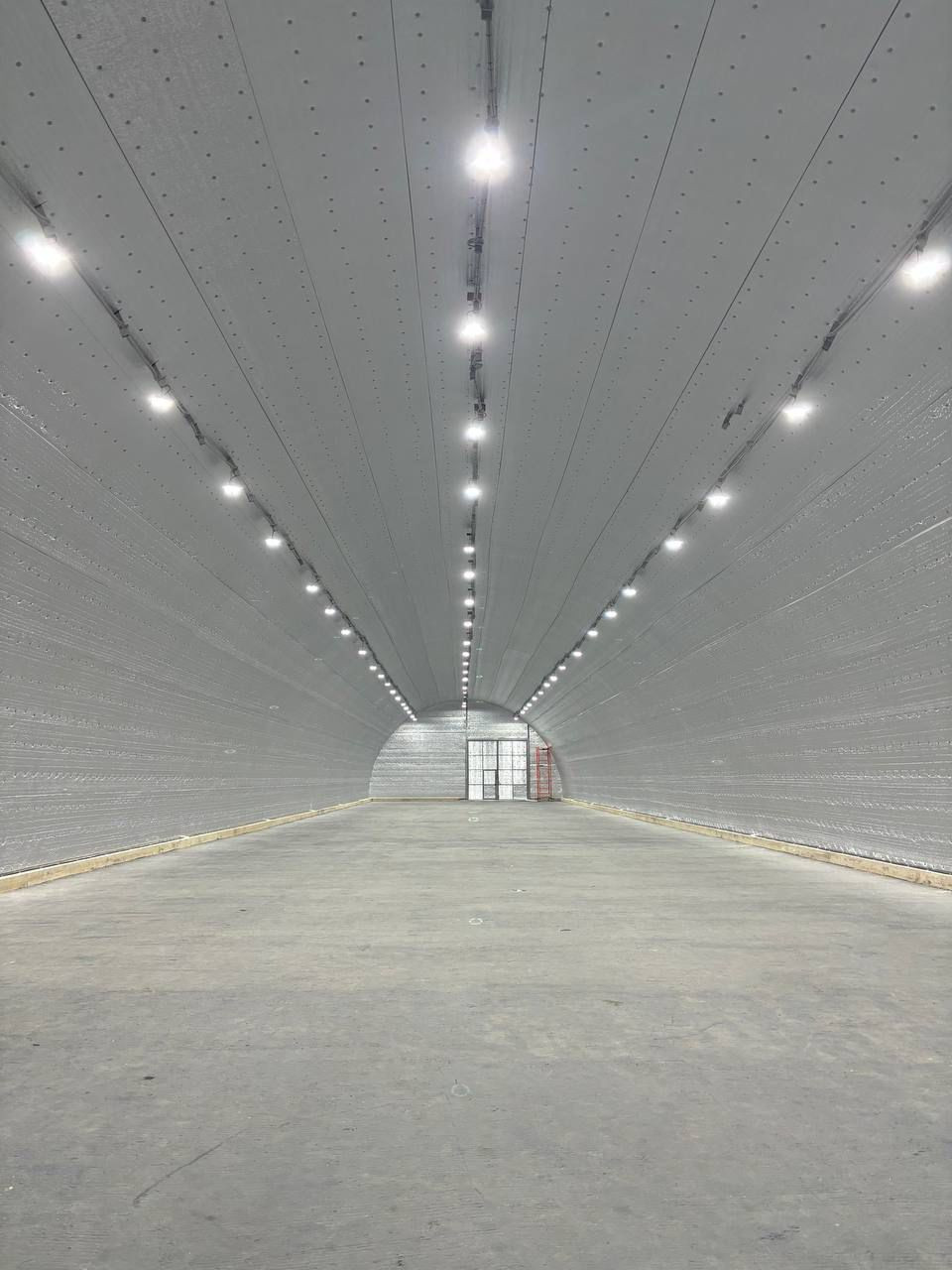 Склад выполнен по американской технологии бескаркасников из высококачественных материалов (оцинкованная высокопрочная сталь), пол бетон М400 толщиной 250 мм с подушкой из песка с армированием 250 мм.