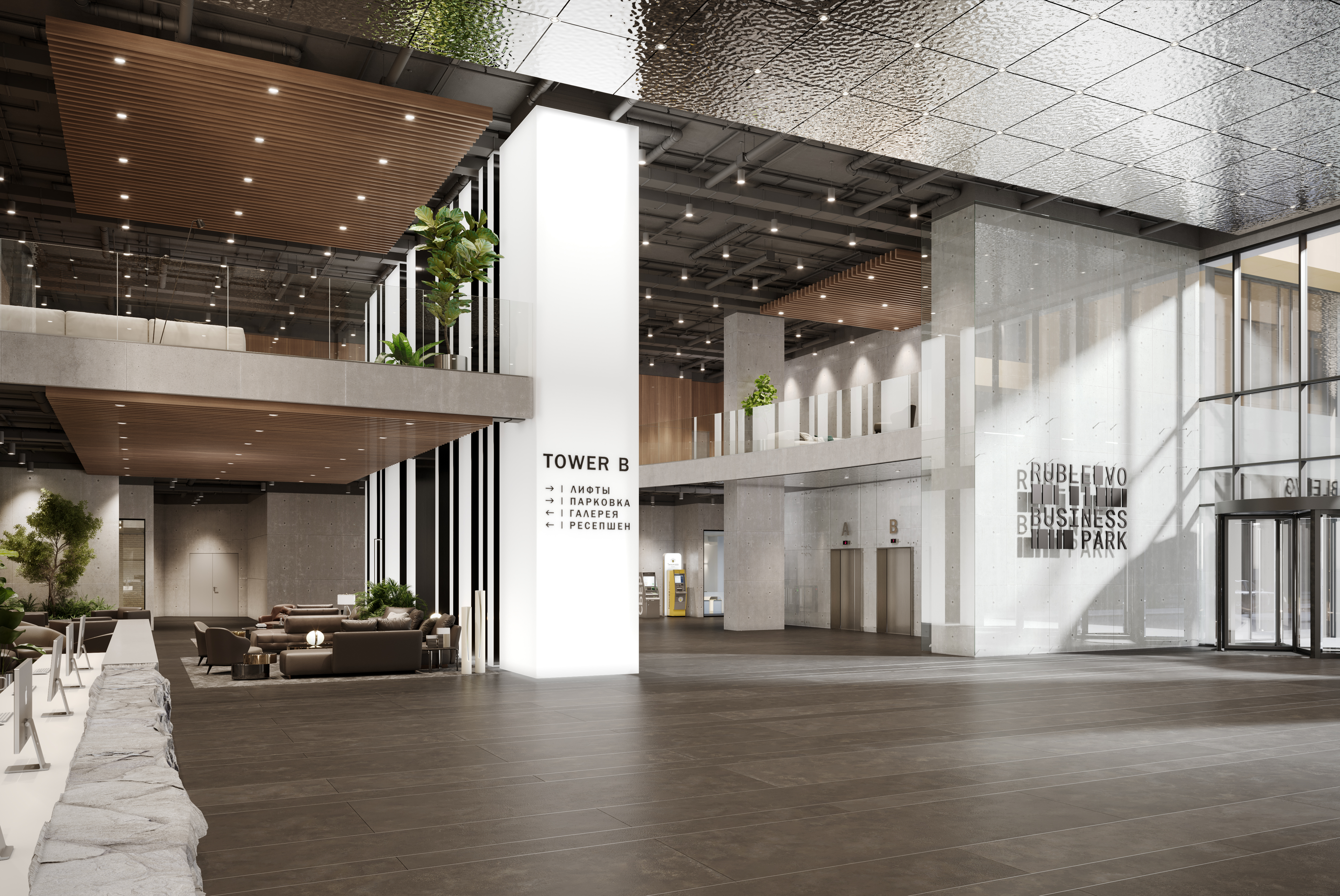 • Гранд-лобби 1500 м², высота 9 м — знаковое пространство с интерьерами от бюро UNK corporate interiors.