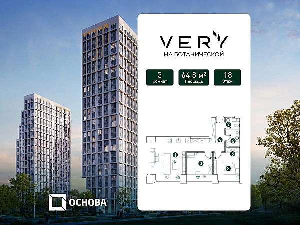 Купить 3к квартиру 64 м² в ЖК Very на Ботанической