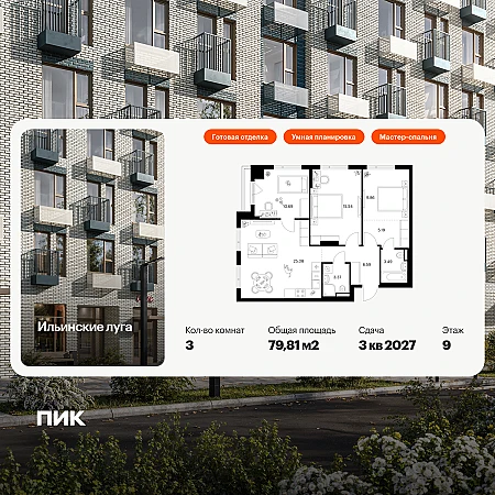 Продаётся 3-комн.квартира площадью 79.81 кв.м на 9 этаже 9 этажного дома (Корпус 4.1, секция 2) проекта ПИК Ильинские луга. Светлый просторный подъезд на уровне земли, функциональная планировка, большие окна, с отделкой.