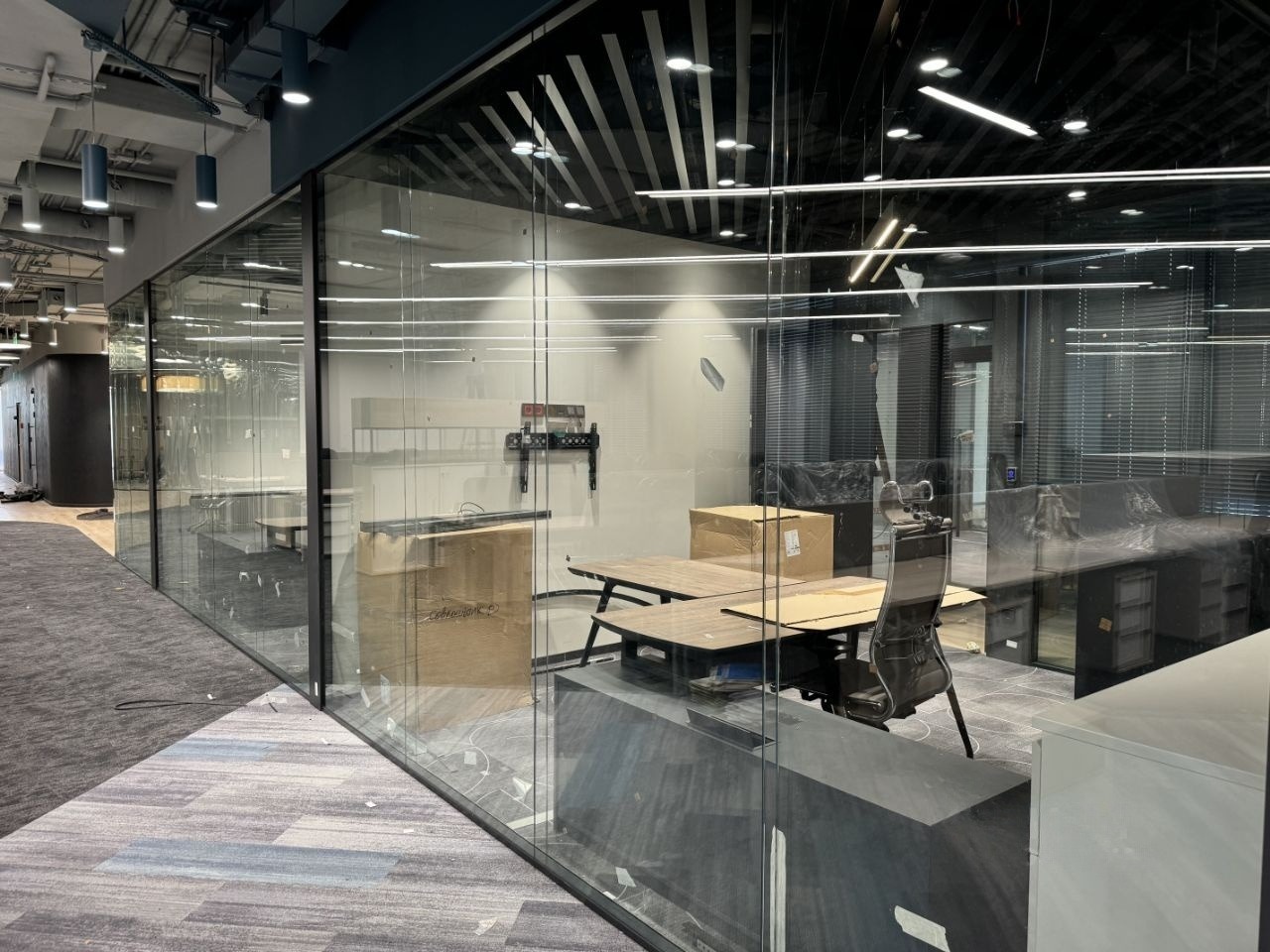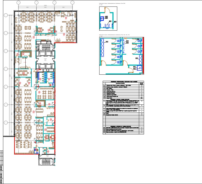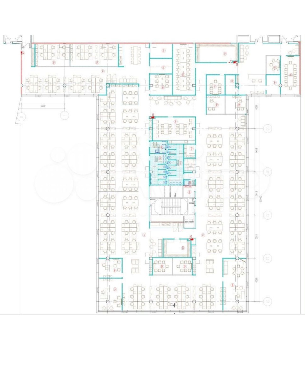 В блоке есть зона ресепшен, гардеробная, кухня, кабинеты, переговорная и кроссовая.