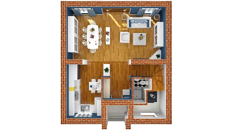 На первом этаже можно разместить кухню, гостиную с камином и выходом на участок, санузел и котельную с отдельным входом. На втором этаже - главная спальня со своей ванной комнатой, две спальни и санузел. Планировка дома может быть изменена по вашему желанию.