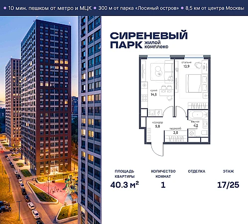 Купить 1к квартиру 40 м² в ЖК Сиреневый парк