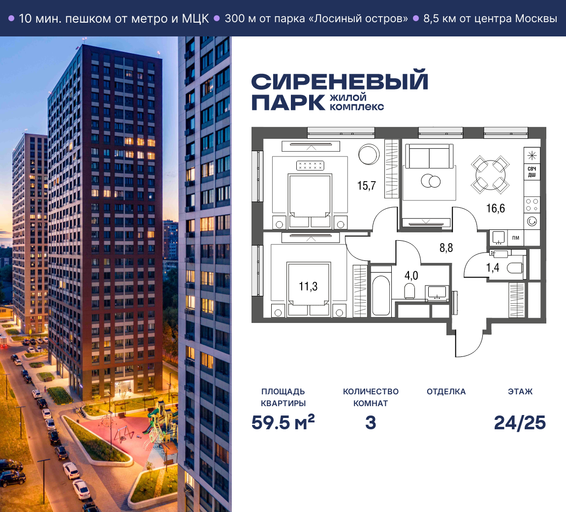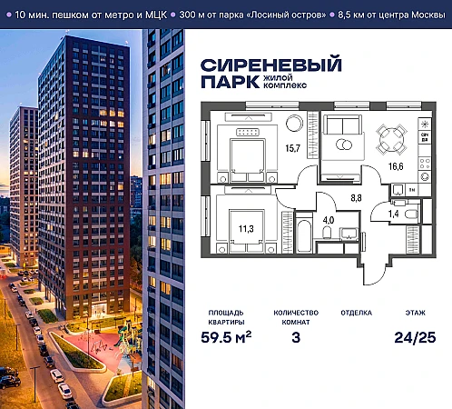 Купить 3к квартиру 59 м² в ЖК Сиреневый парк
