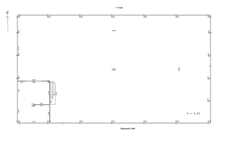 Здание ангарного типа. Площадь склада по полу - 720 кв.м. (остальной метраж- антресоль). Высота потолка по свесам кровли - 6,9м в коньке - 9,65 м. Стены - металлические профильные листы со стеклопакетами. Кровля - металлический профиль.